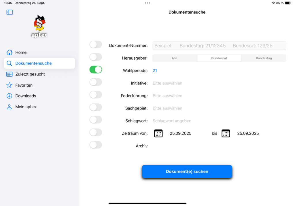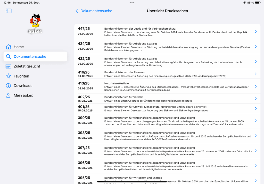 Mit apLex haben wir einen Service entwickelt, der diese Arbeit für Sie übernimmt. Alle in den Bundestag und Bundesrat eingebrachten Gesetzgebungsvorhaben werden frühstmöglich ausgewertet und konsolidiert.